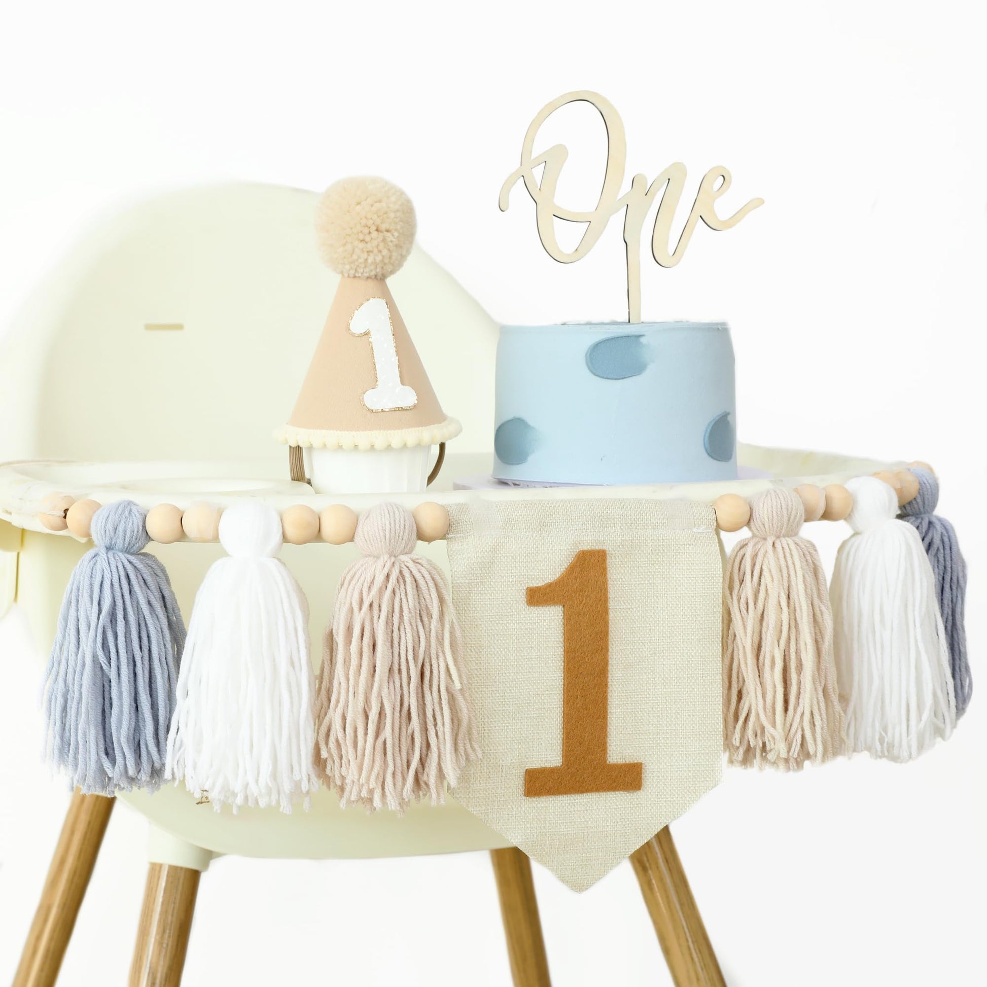 Includes a blue-toned tassel highchair banner with wooden beads, a soft felt birthday crown, and a cake topper — offering a beautifully matched setup in one easy bundle.